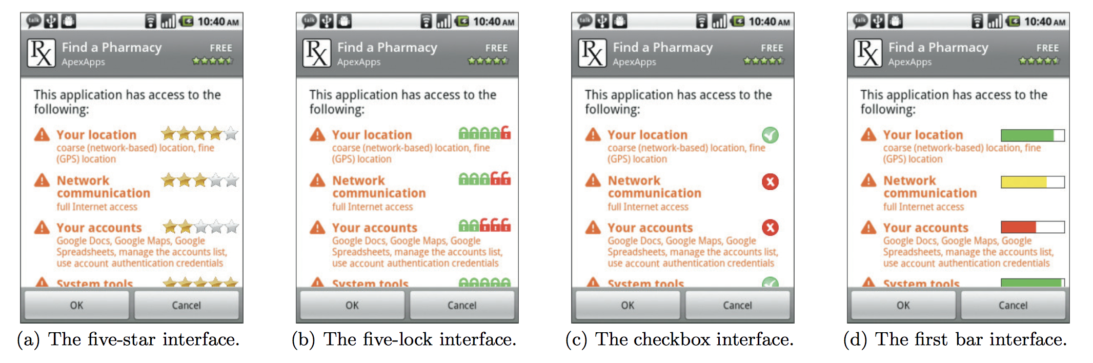 这篇文章研究了如何在应用市场中的显示 app 的 permission/privacy 情况,作者用 Amazon Mechanical Turk 测试不同用户对于不同形式的 privacy 级别显示的理解。比如说下面几个例子,不同的人看到的信息是不一样的。