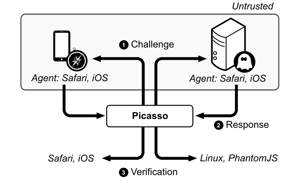 Picasso 根据 HTML5 的 graphical API 在 canvase 上面生成图片,因为不同平台的浏览器会生成的不可预测的 noise,这些 noise 就可以用来区分浏览器。Picasso 的工作流程是这样的,首先服务器会发送一个 challenge 给客户端,也就是浏览器。浏览器会根据 challenge 渲染出相应的图片返回给服务器。最后,服务器根据图片的不同来判断是由那种浏览器生成的,区分出是 iOS 的 Safari 或是 Linux 上的 PhantomJS。