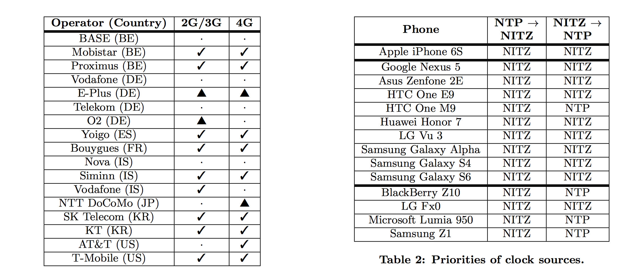 这篇文章主要研究了 NITZ 和 NTP 两种方式,在不同的操作系统下,不同的网络制式下,以及不同的手机上的不同现象。比如说某些移动运营商在 2G/3G 里提供 NITZ,但在 4G 里却没有。不同手机对于 NTP 和 NITZ 两种方式的优先级也不同。这些不同就引发了一些问题,作者通过伪造时间,触发了系统的一些 bug。